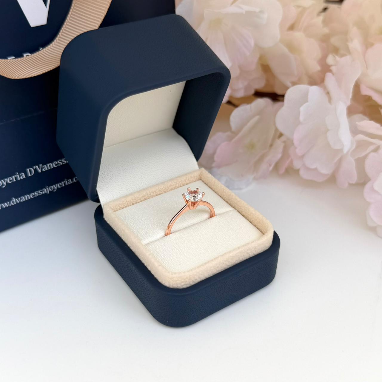 Anillo de aleación bañado en Oro rosa 18k y piedra central de 6 mm. Ver guía de tallas