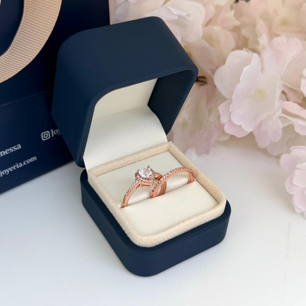 Anillos de Aleación bañado en Oro rosa 18k con incrustación de Zircones a los lados y uno central en forma de corazón.